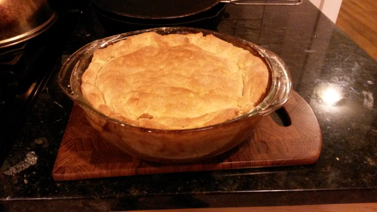 Remove from the oven, place a pie crust over the top (I used Type L biscuit mix here; my sister in law in the UK uses suet dumplings.)