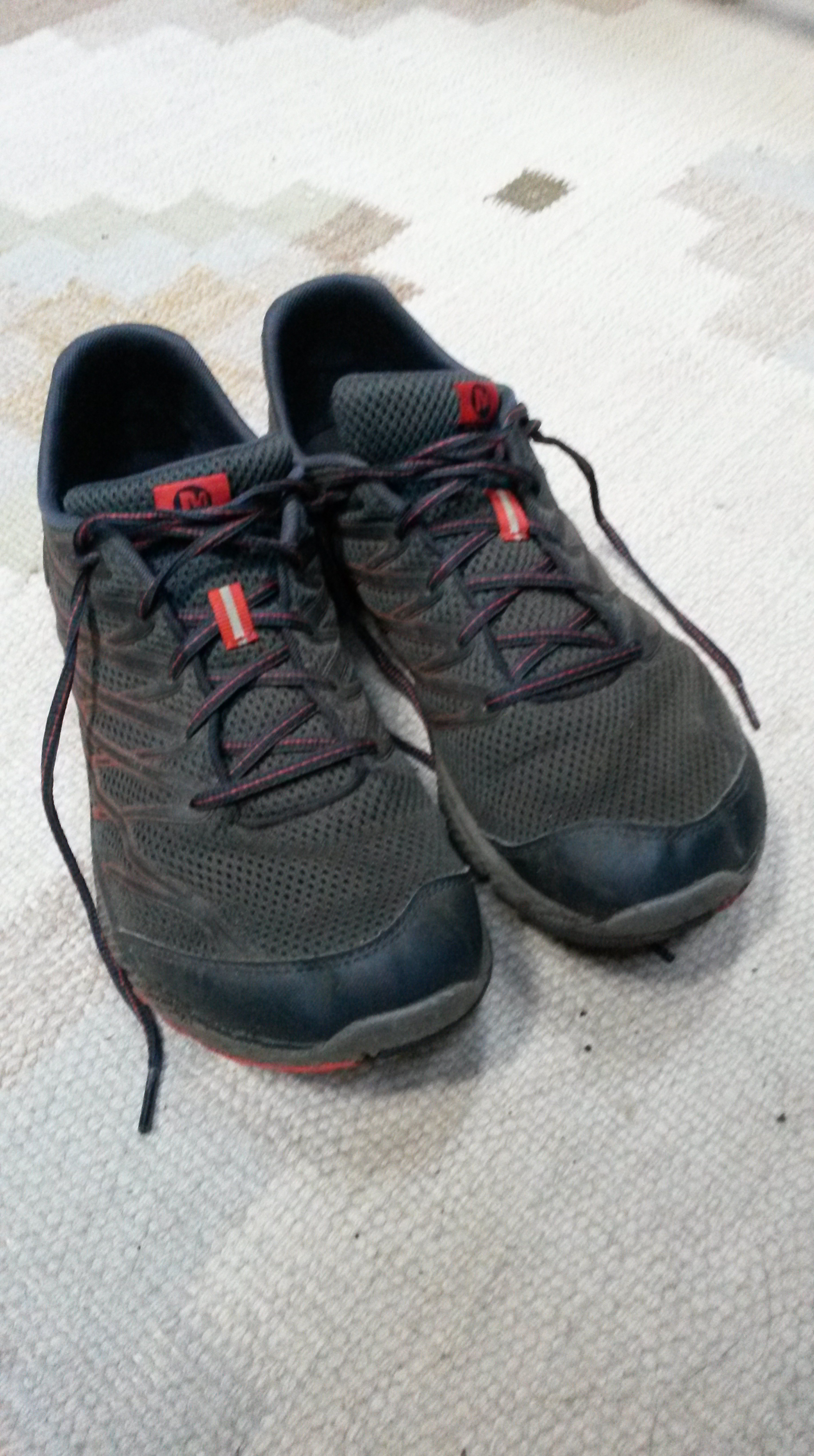 These are Merrell bare access 4 trail runners. Ones that happen to be used and peat-stained. It doesn’t look quite as pretty as the catalog image. I’ll typically wear only a thin pair of liner socks. There are two approaches to keeping dry feet. Do and don’t. In reasonable 3-season hiking the best approach is to let your feet get wet and then wear gear that dries quickly. These are laced with a “heel lock” which holds them on tightly without requiring extraordinarily tight lacing. It also means that the backs of the shoes don’t wear out and break down. Most trail runners wear out quickly, so I only wear these for walking. They have a thin vibram sole. Mine don’t slip when they’re wet, which is good. Not just good but necessary. The thin sole is a blessing and a curse. You can feel your way, it’s almost barefoot. It also means you can feel sharp rocks and gravel.