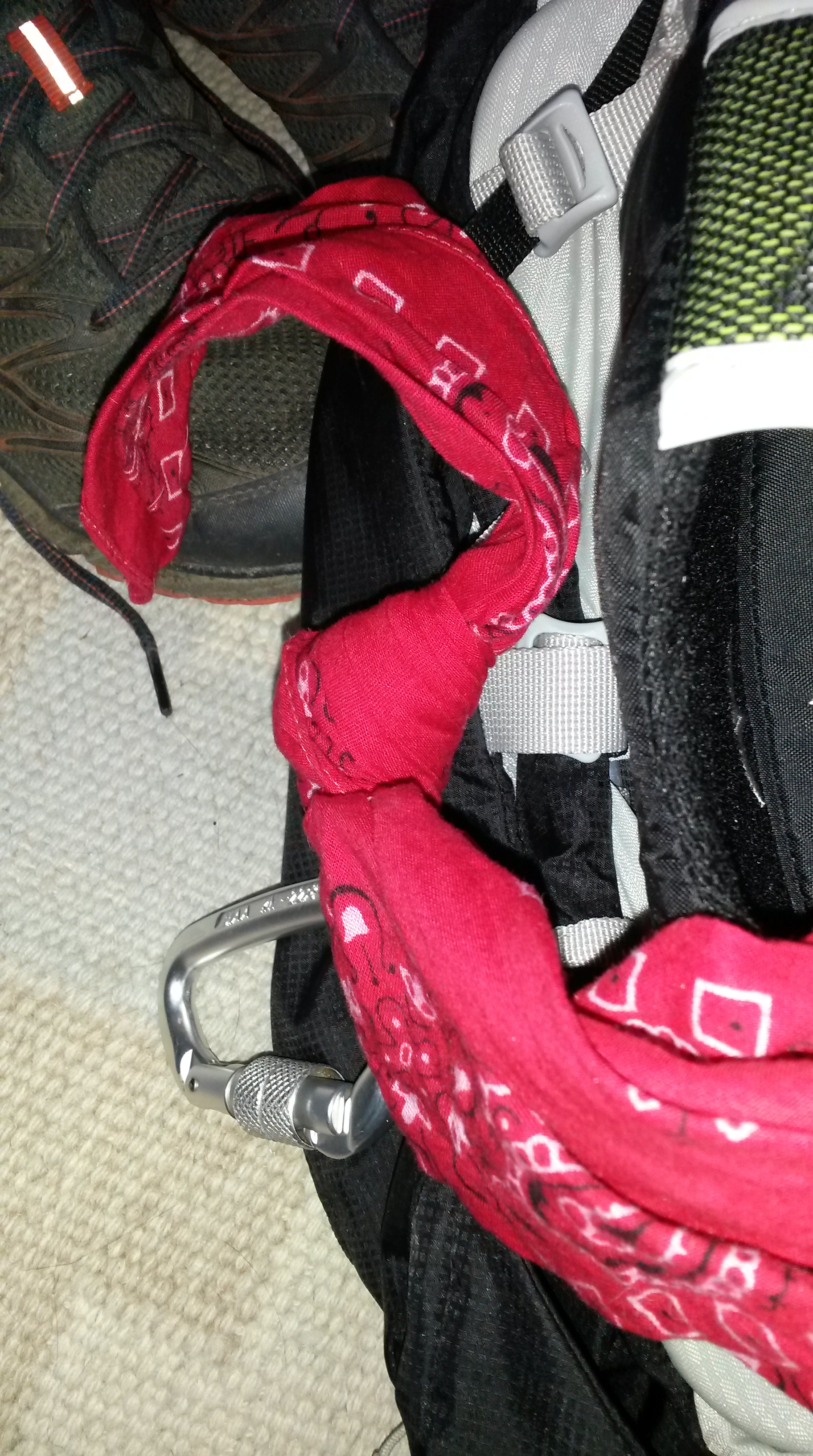 I always add a couple of extras to my packs. A real carabiner – from the climbing section at REI and not a cheap knock off, is essential. I clip my walking sticks and map case to it. It can also double as a pulley when I hoist my pack in bear country. This carabiner is a locking one which is better for my use than a clip one because it won’t accidentally clip on to things. The other thing is a bandana. Cotton might kill, but a bandana is a life-saver. A pot holder, an emergency hat, when soaked in water it can keep you cool, and um, is useful for washing those delicate areas when they start to chafe. I also tie it to the pack I’m using as sort of a badge of honour.