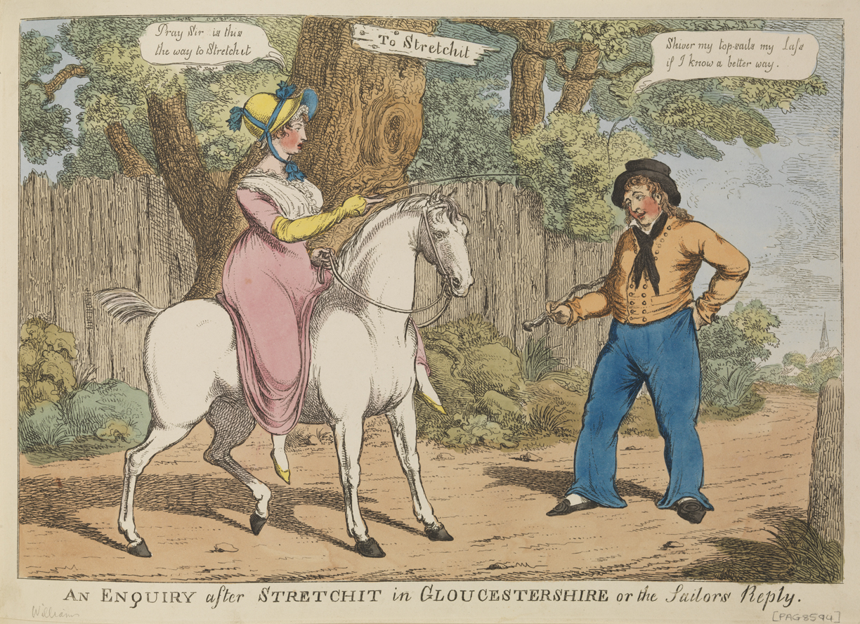 Having women ride astride is a very common error in historical films. Women generally rode sidesaddle. There were practical reasons for this as what the English call “pants” weren’t worn by the gentle gender. They did have leggings and stockings, but wore something closer to a suspender belt than modern undergarments. (for what it’s worth men wore something much like a cross between modern swimming trunks and “boxers”, with a drawstring and without the mesh inside.) Personally, the few times I’ve been on horseback I’ve been very glad to have both feet in stirrups and being able to grab the horses’ back between my knees. I can’t imagine what it was like to sit sideways. The young lady in the cartoon is “fast” and the Tar knows it. The featured image shows what could be done, if you had the guts. (If you look carefully, she’s raised from the seat and having significant “air time!”)