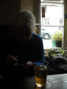 We stopped in the Stag – which is an excellent pub – and let two sweaty, dirty, and tired hikers enjoy their pints inside. It had a guitar in the corner so if you were a better player than I am, you could entertain the crowds (or if you were a better runner you might escape the disapprobriation.)