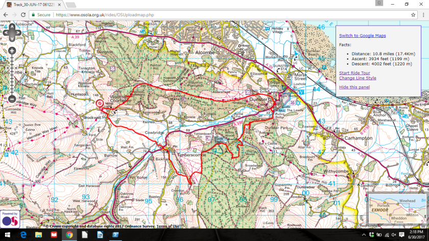 We headed uphill on the wrong road, but eventually found our way to where we could see Dunster in the distance.