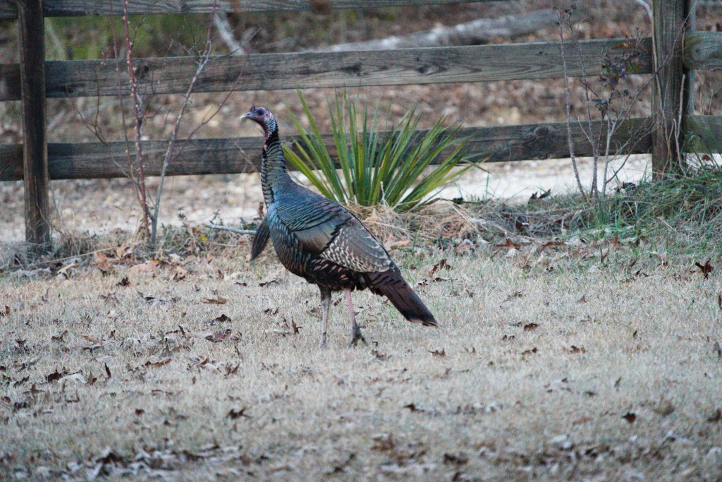 The wild turkeys have been visiting of late. They’re a bit hard to photograph because as a “tasty bird” they are also extremely shy. Getting these images, at dusk, took pushing my camera’s limits.