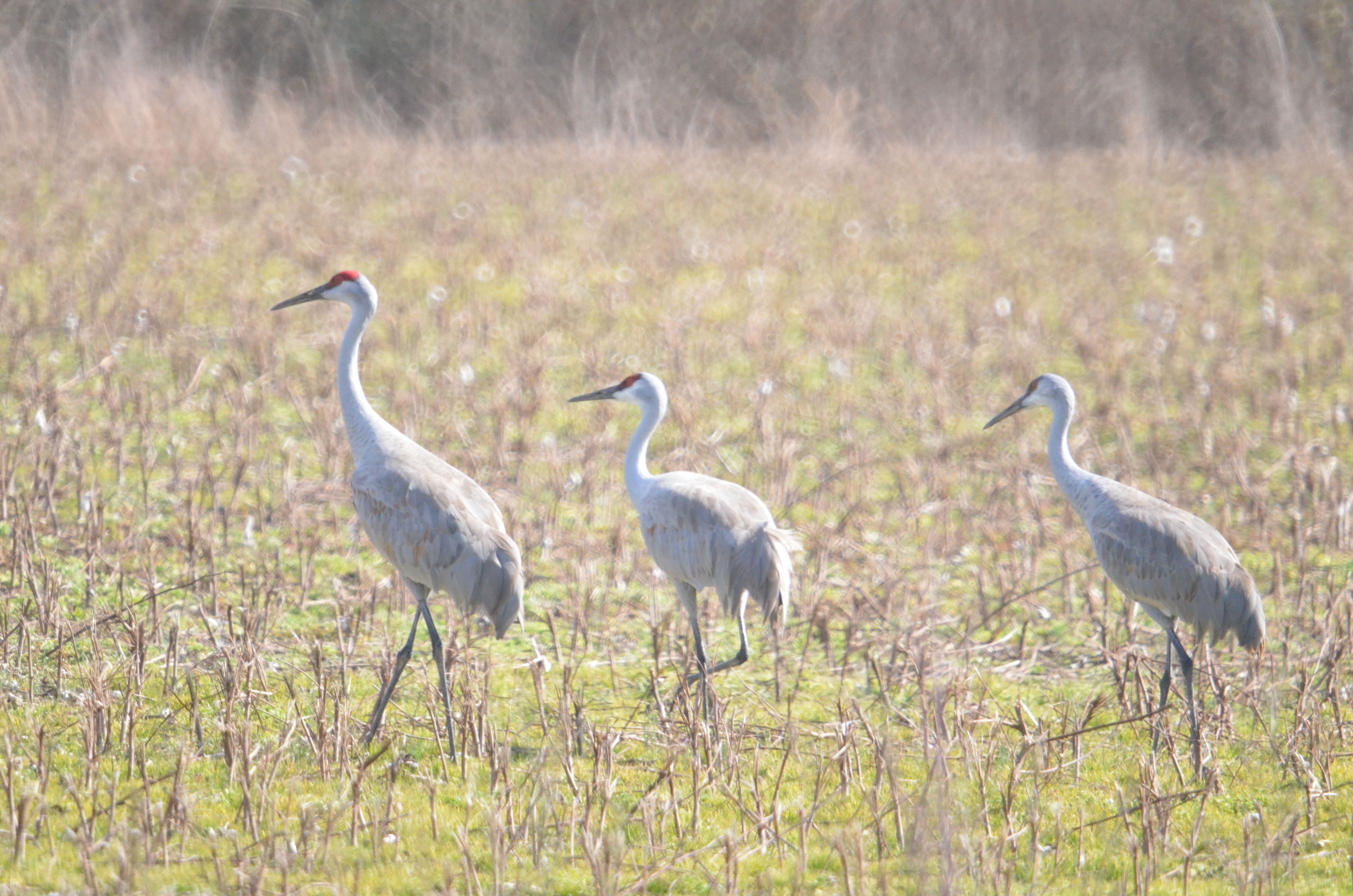 The Sandhill Cranes overwinter in northern Alabama near Weiss Lake. The flocks have been getting bigger as the word seems to be spreading among them. They concentrate on damp/flooded cotton and soybean fields where they can find various small creatures to eat.